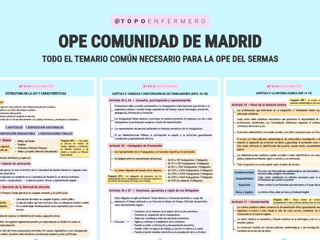 ¡Hemos esquematizado toda la parte común que se incluye en la convocatoria para ti! Estos esquemas están elaborados para facilitar y agilizar tu estudio, así como priorizar toda la información. En el material encontrarás post-it señalando las preguntas que ya han caído en exámenes del SERMAS y los artículos marcados en rojo que ya han sido preguntados. Así sabes exactamente qué estudiar y qué priorizar en el caso de que no tengas mucho tiempo.